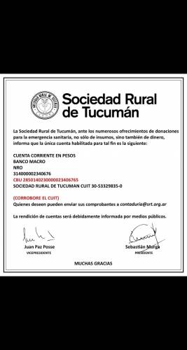 La Sociedad Rural de Tucumán frente a la Emergencia Sanitaria por la pandemia del COVID-19, se encuentra gestionando donaciones y Cooperativa Generar apoya a esta inciativa.