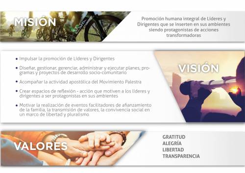 - La Promoción de líderes y dirigentes mediante el diseño, gestión, gerenciamiento, administración y ejecución de proyectos y acciones que impulsen y permitan acompañar al Movimiento Católico Palestra en su Misión.