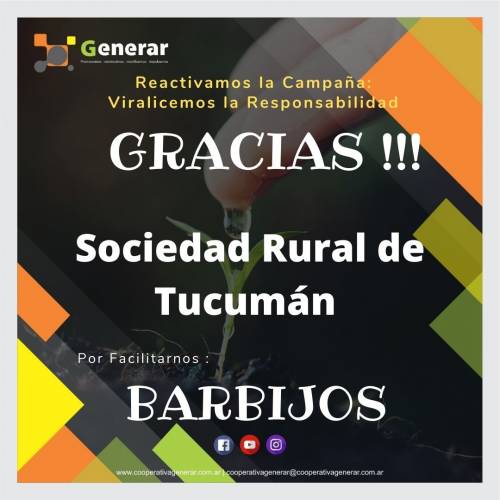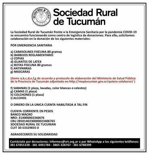 La Sociedad Rural de Tucumán frente a la Emergencia Sanitaria por la pandemia del COVID-19, se encuentra gestionando donaciones y Cooperativa Generar apoya a esta inciativa.