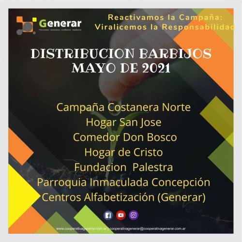 Campaña apoyada por Generar Redes!!! Producción solidaria de barbijos. Participan vecinos e instituciones organizados en redes de acción y respetando todos los protocolos. Los barbijos se entregan en: barrios vulnerables, parroquias, comedores infantiles, merenderos,operativos BAF (Búsqueda Activa de Febriles); instituciones de bien publico. Algunos de los lugares que entregamos son: Comunidad de Amaicha del Valle, Alderetes, Costanera Norte, Centro Médico de Barrio San Martin, Escuela Solidaridad y Paz y Polideportivo Don Bosco, cooperadoras de limpieza de hospitales, parroquia nuestra Sra del Valle, Caritas Plaza Vieja, Hogar San José, Comedor Infantil don Centro Don Bosco, Fundación Palestra, San José, Asociación Conciencia, La Poderosa.