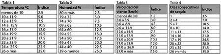 El valor del índice se obtiene sumando los valores de las tablas 1, 2, 3 y 4. La cuenta de los días de sequía (Tabla 4) se reinicia luego de una precipitación superior a 5 mm.(*)